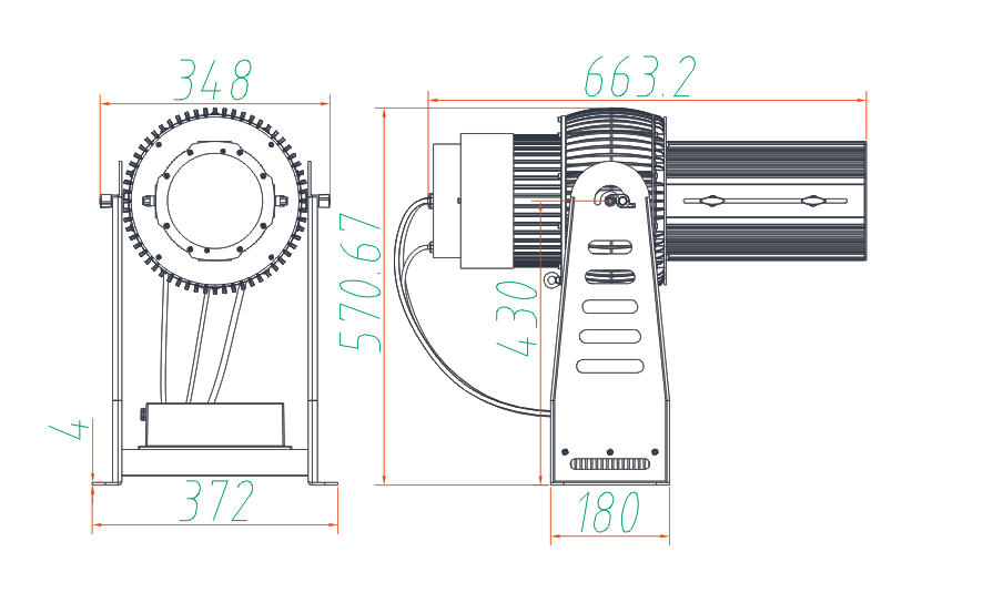 光源亮度:1颗350W白光LED,总5540流明输出,轴向16060cd
